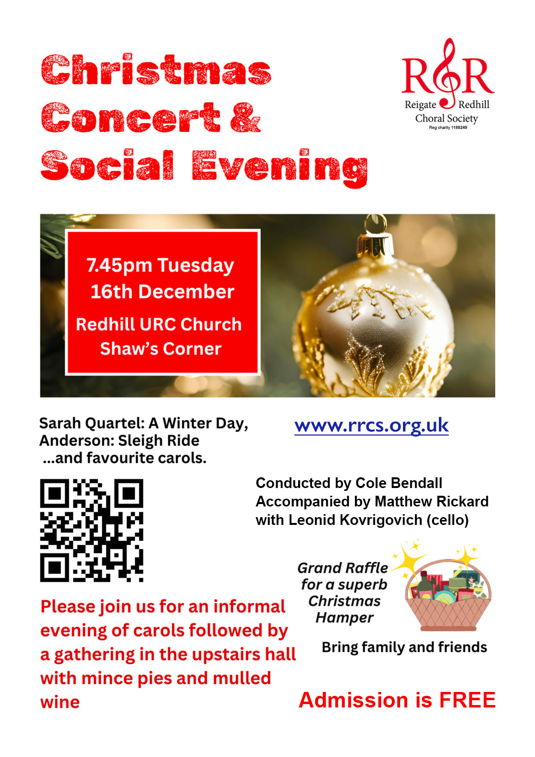 We are a friendly non-audition choir, performing regular concerts with professional soloists, and often with orchestral accompaniment. We rehearse at 7.45pm on Tuesday evenings in the Upper Hall, at the URC Church, at Shaw's Corner, RH1 6AU, mid-way between Reigate and Redhill.